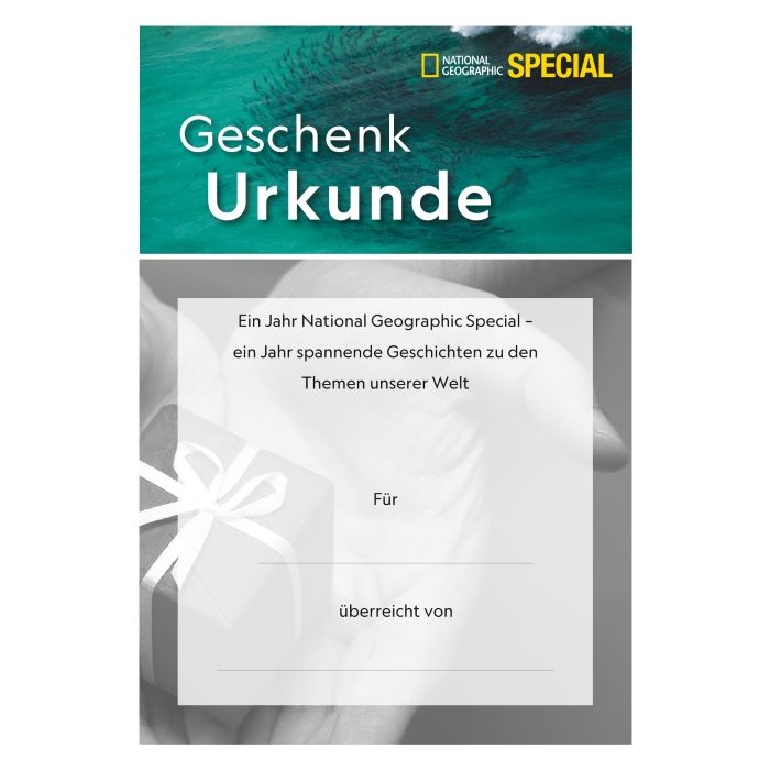 Mit NATIONAL GEOGRAPHIC SPECIAL verschenken Sie die hochwertige, monothematische Sonderheftreihe von NATIONAL GEOGRAPHIC. Vier Mal pro Jahr inszeniert die Redaktion die bewegendsten Geschichten mit den faszinierendsten Fotos aus den letzten 130 Jahren von NATIONAL GEOGRAPHIC. Sie können sich sofort eine Geschenkurkunde ausdrucken und dem Beschenkten überreichen, den Rest übernehmen wir. Dazu erhalten Sie eine hochwertige Dankeschön-Prämie zum Behalten oder Verschenken. Kein Risiko - das Geschenkabonnement endet automatisch.